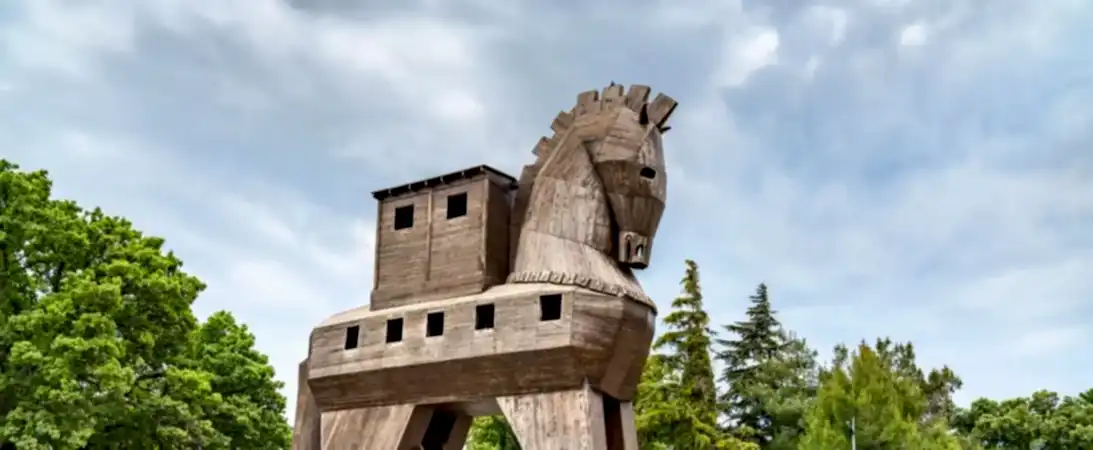 Explore the historical treasures of Troy, including a replica of the Trojan Horse, the fortification walls of Troy VI with its tower and gateway entrance, the Temple of Athena, the entrance ramp to Troy II, and the Odeon.